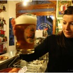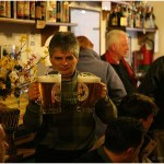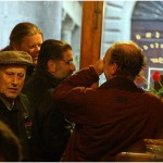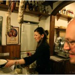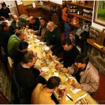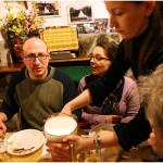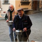 Natale and his son cooked the baccalà on the home stove and then carried two saucepans through the piazzas to Aristo’s (also managing this way to keep his famous recipe for baccalà quietly in the family and still secret to the outside world*) As the images show there has been one large change in the traditional way of eating baccalà – modern Barghigiani, most of whom all seemed to be Lake Angels, seated at the table this evening all opted for beer and in industrial quantities, keeping Marino and Federica on their toes all evening. Strangely enough the only person seen with a glass of wine in their hand was Hamish Moore from Scotland who has made Barga his home as the Artist in Residence 2008 (articles from Hamish here) but that too seemed to be “medicinal” – a calmer before he left to play his pipes in a private concert at one of the villas in Barga Vecchia.