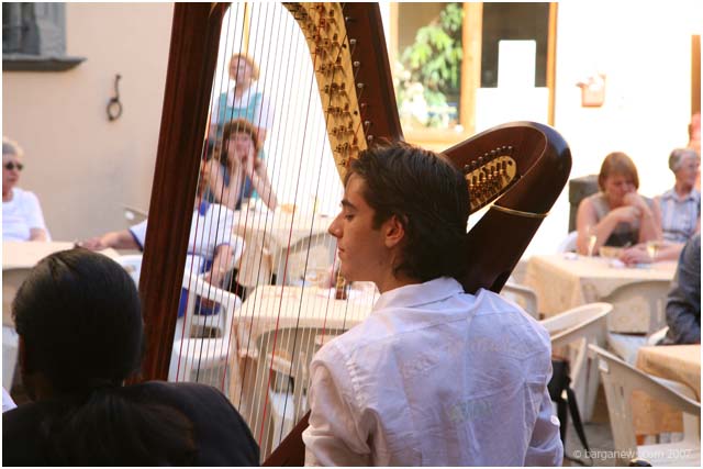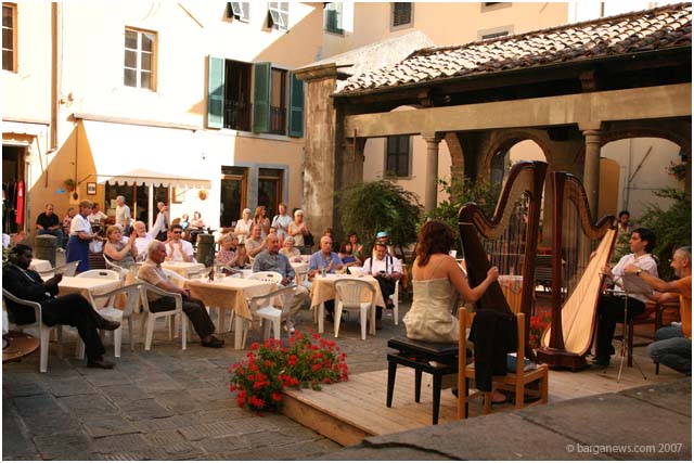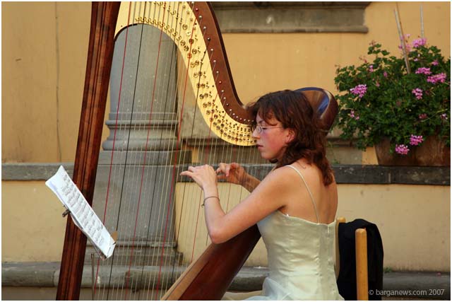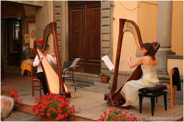 The summer season of classic music opened this afternoon in Barga Vecchia with the concert organised by the L’istituto Superiore Musicali Luigi Boccherini at Lucca. Two harpists played a selection of music ranging from Debussy and Haendel to a series of pieces all with a latin american flavour. The two musicians were both from Barga and studying at Lucca; Francesca Nardi and Andrea Solinas