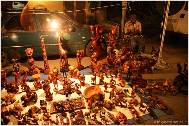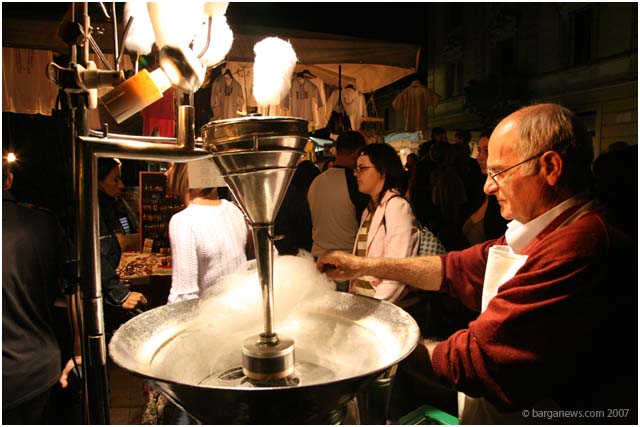 Thousands of people milling round at midnight among the market stalls and shops selling every thing from African masks to shoe laces, clothes, antiques, flashing toys or sweet things to eat. There is something strange about buying a candyfloss in the dark … hmm, maybe not … fairgrounds are also open at night are they not ?