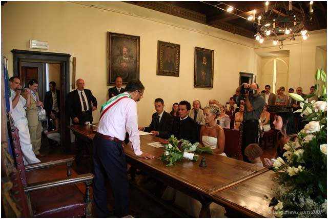 Another large wedding in Baga Vecchia this afternoon. Barga is fast becoming THE place to get married with many people coming in from abroad to celebrate their vows. Today instead it was a local marriage. Alessandro Bertoncini and Elisabetta Marroni became man and wife in the Palazzo Pancrazi in front of a large group of family and friends. All of the staff at barganews wish them a long and happy marriage.