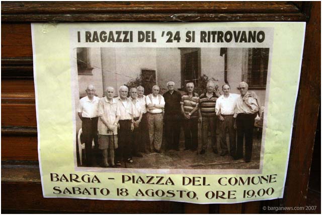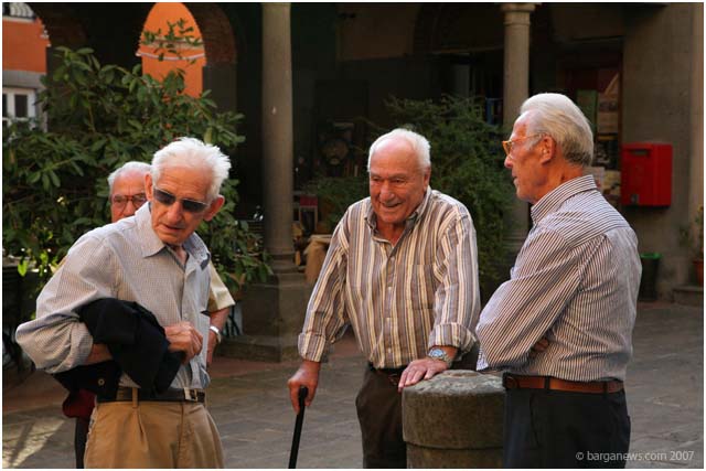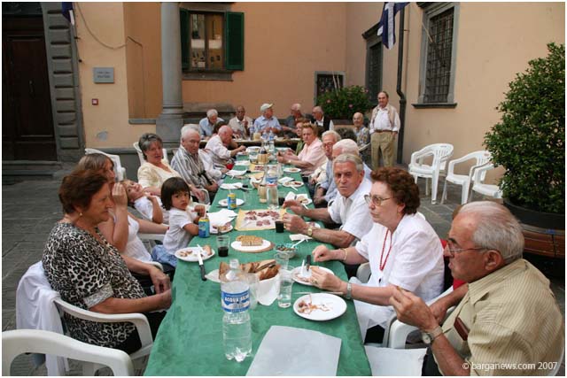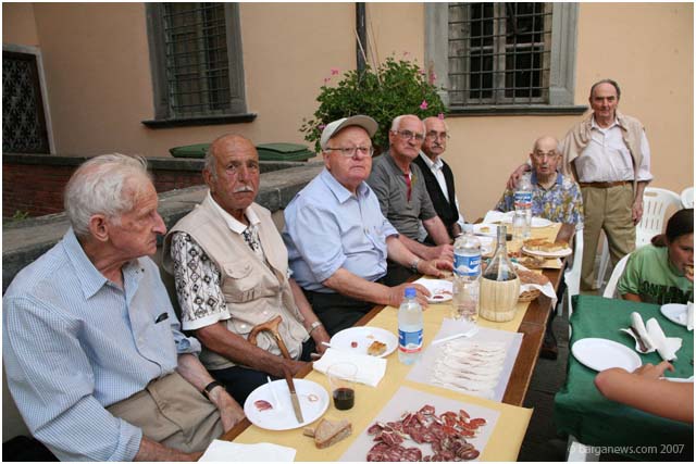 It's a meal held every year in Piazza Salvo Salvi in front of the Palazzo Pancrazi. Salami, cheese, freshly cut ham and bread and of course – flasks of red wine. So what is so special about these tables set out in the piazza? It's the 12 men sitting around the tables with their families. They all share at least one thing in common. They were all born in the year 1924. So some quick maths brings up 83 x 12 = 996. Nine hundred and ninety six years of experience between them – almost as old as the Duomo of Barga and double the age of the Palazzo Pancrazi behind them.The class of 24 meet each year in August to celebrate their good fortune and to enjoy the good things in life. Long may they do so.