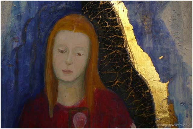Silvana is known in this area for her work in the theatre but this exhibition shows that she is just as accomplished as a painter, making a series of works, often with a plaster base and using gold leaf that give the appearance of untouchable medieval religious icons but at the same time, cry out to be touched and handled.
