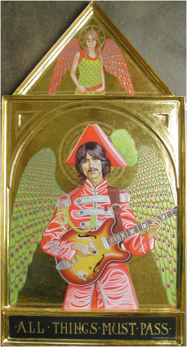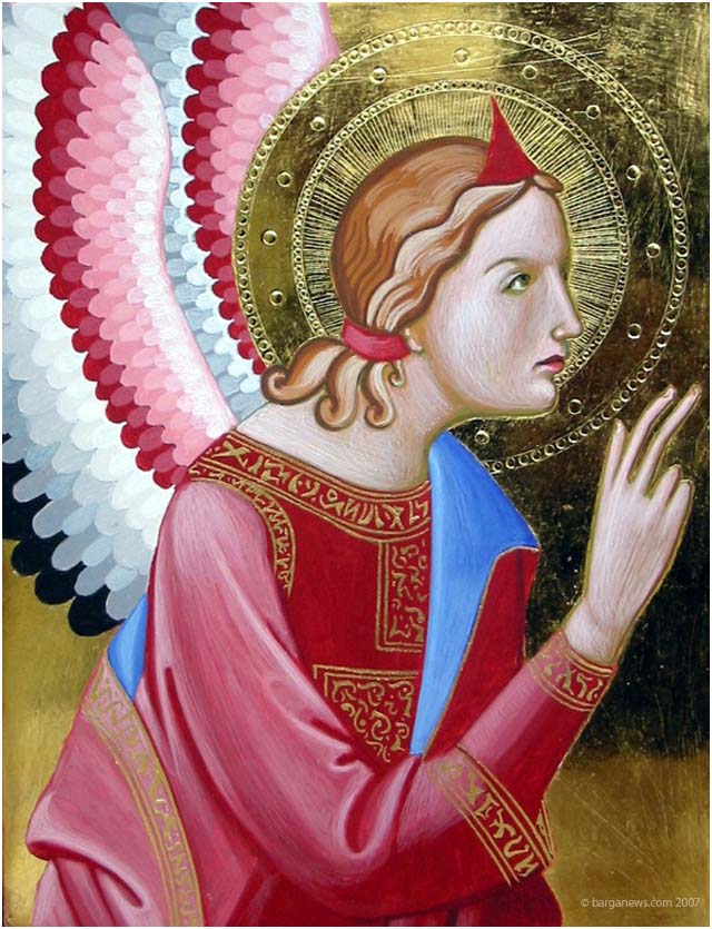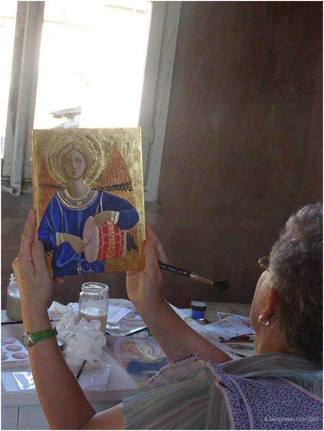 Last week in Barga, Peter Murphy a noted British artist who combines making both traditional panels and altarpieces for churches in the UK, with being a high profile member of the Stuckist movement, brought his unique talent to town. He was here for a course entitled 'Learn to Paint like Fra Angelico in Tuscany' Peter tutored a small group of students in the techniques of trecento and early quattrocento Italian panel painting and gilding. Using 'Il Libro Dell' Arte' by Cennino d'Andrea Cennini as a guide, students learned how to gild using 24 carat gold leaf and paint using egg tempera made fresh each day from ground pigments and egg yolks. The students worked from a small selection of traditional images of the Madonna and Child and various angels. The course was organised by Lorraine McAvoy and Joe Pieraccini of Artemisia Holidays and took place in the altana on the top of Casa Cordati – the altana is famous for its views over the roof tops of Barga Vecchia but also for its decorated walls painted in the ‘60s by Bruno Cordati in the manner characteristic of his late period.
