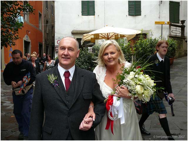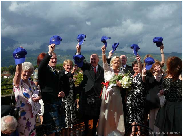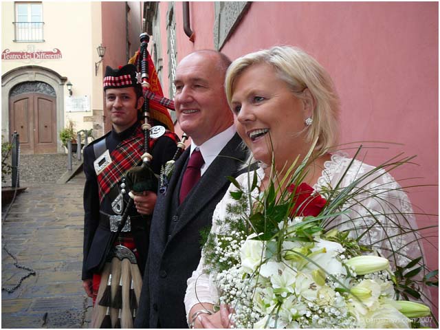 The sound of bagpipes in Barga Vecchia and everybody reaches for their umbrellas. Not really true, just one of those urban legends that every time there is a Scottish event in Barga the weather changes and gives us what is looked upon at traditional Scottish weather – low cloud, cool temperatures and slightly damp. This week is really did look as though there was some truth in the legend though as the wonderful summer weather and drought finished in a series of huge thunderstorms and lashing rain just as the same time that there was a Scottish wedding taking place. Douglas Harper and Carol Morin from East Lothian Scotland were here in the city with a dozen guests for their wedding in Palazzo Pancrazi .