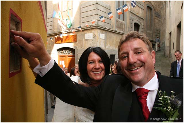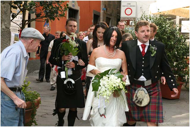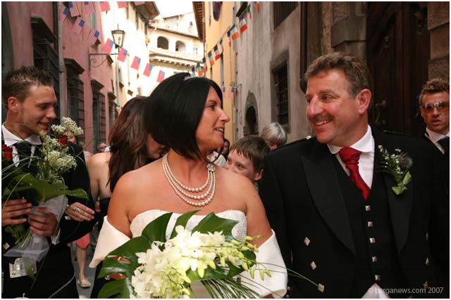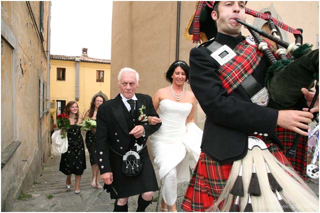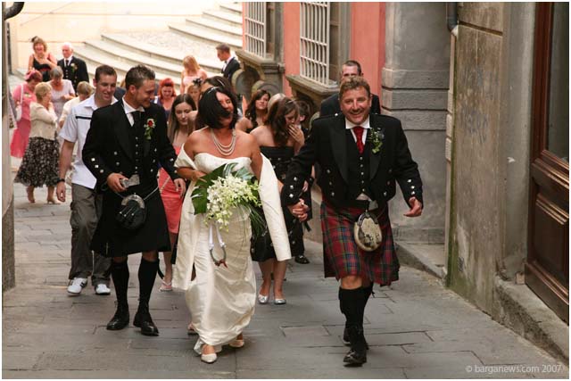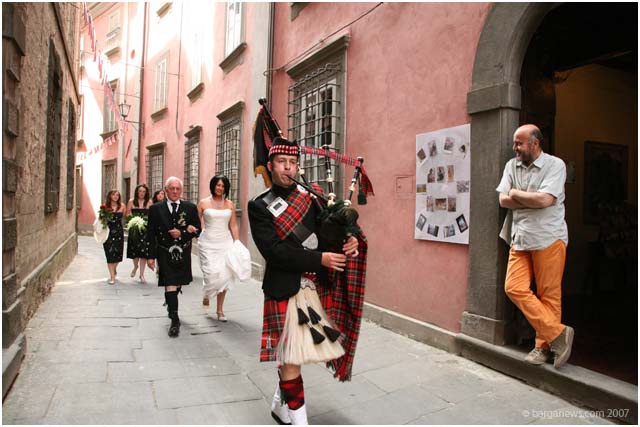A wedding with a Scottish flavour in Barga Vecchia. The wedding of Chris and Kev. The Palazzo Pancrazi was full of laughter today for what was the most exuberant and joyful marriage seen in Barga this year. It all started fairly peaceful enough with the entry of a single piper into the castle.