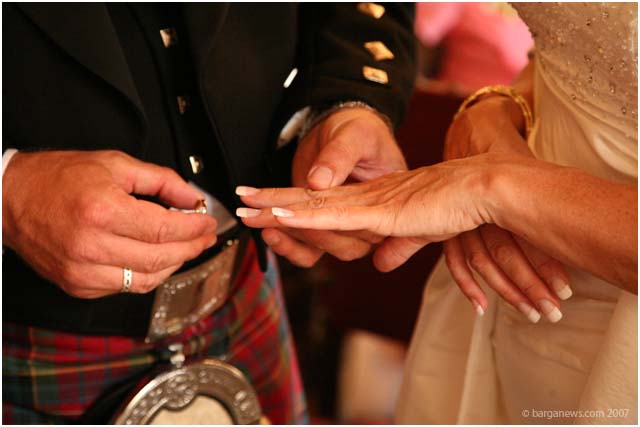 The sound of the lone bagpipes filled the narrow streets and the sound just got louder and louder as the voices of the happy couple and their guests joined in.