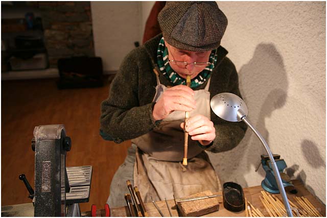 We are probably one of a few remaining pipe makers in the world who continue to use cane (as opposed to synthetic materials) for the making of drone reeds. To achieve this and to make reeds of the highest quality the cane has to be carefully selected. We make an annual trip to Cogolin near St. Tropez in the south of France to buy from a cane producer who is one of the finest in Europe. Sr. Rigotti and his family grow cane , store it in just the right circumstances , cure it and produce a raw material for the world that is as good as it comes. Not only that, but they run a small family run factory producing, with this cane , fine reeds for clarinets and saxophones and slips of cane for reed makers for oboes and bassoons. Sr. Rigotti certainly changed my life when he allowed me to come and pick the cream of his crop and showed me a pile of drone cane which not only will see me out but had my name on it too. They're lovely people and all of this goes to restore a faith in human nature. !