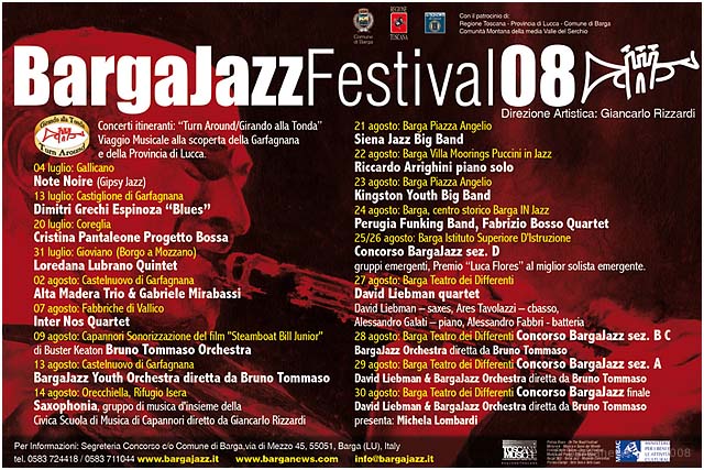 The final dates were published this morning for the Barga Jazz Festival 2008. Guest of honour will be David Liebman, one of the foremost contemporary saxophone players who has been active on the international Jazz scene since the early ’70s