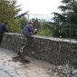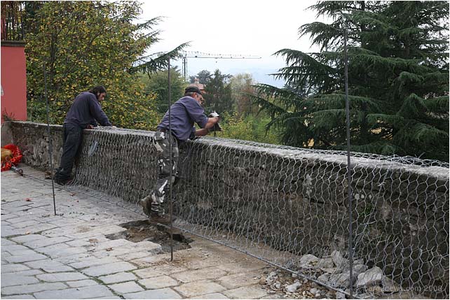 One of the workers with the co-operative repairing the 11 metre high main wall just below Porta Macchia risked life and limb yesterday when he accidentally cut through a buried electricity cable. Rubber handles on the machine he was operating, a good pair of heavy work boots and a great deal of luck kept the 380 volts away from his body and the only damage, apart from maybe his pride, was the loss of power to half of Barga Vecchia and parts of the Fornacetta.
