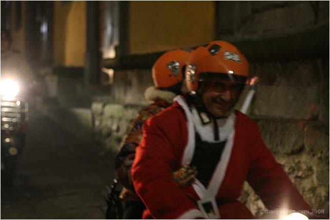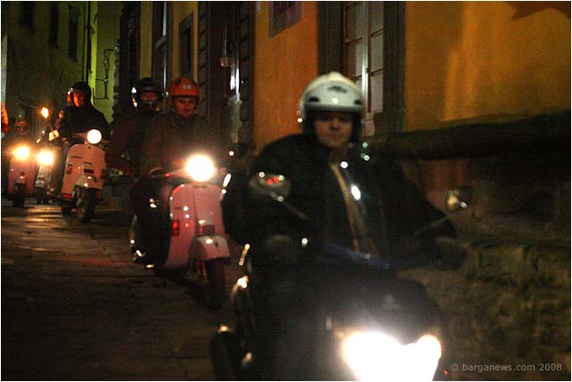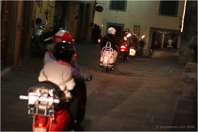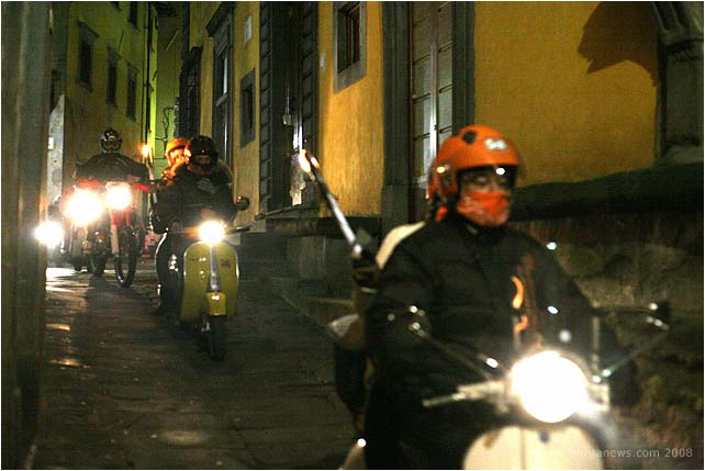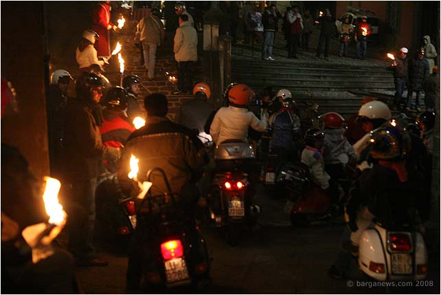 Huge smiles all round last night for the second Fiaccolata di Natale – Christmas torchlight procession organised by the Vespa Club Barga. Last year damp weather (to put it mildly) caused the cancellation of the annual event but this year the rain kept away and more than 50 Vespas joined the procession as it wound its way from Piazzale Fiat down in Barga Giardino up into the narrow streets of Barga Vecchia.