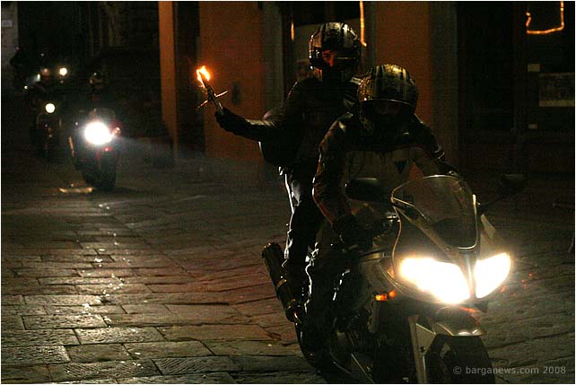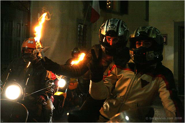 This year added to the high sound of the Vespas was a far deeper, throaty and much more powerful note as over 20 motorcycles joined in for the occasion. The torch bearing cavalcade made a brief pit stop for refuelling, thanks to the Vin Brule on offer from the Lake Angels outside of the Teatro dei Differenti and then once more mounting their saddles and roaring off into the night.