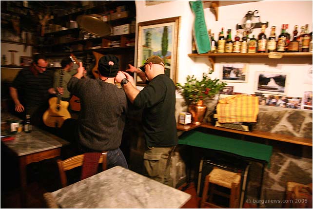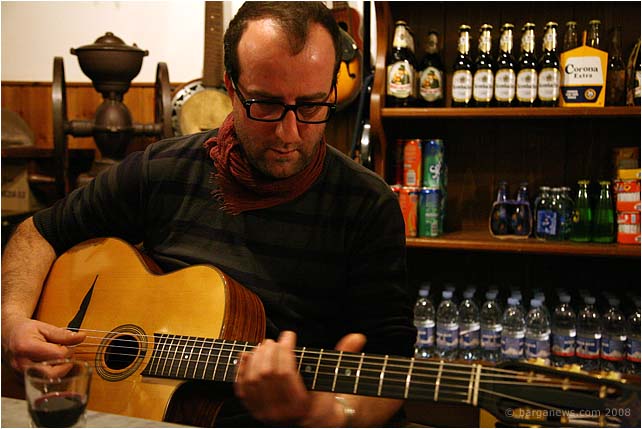 Fabio Guazzelli on guitar providing a strong rhythm background for Alessandro Rizzardi on mandolin and Luca Giovacchini on guitar to weave their Django Reinhart based tapestry. A video below goes some way to giving you the feel to Aristo’s as these musicians sat and enjoyed the music, company … and of the course – the red wine.