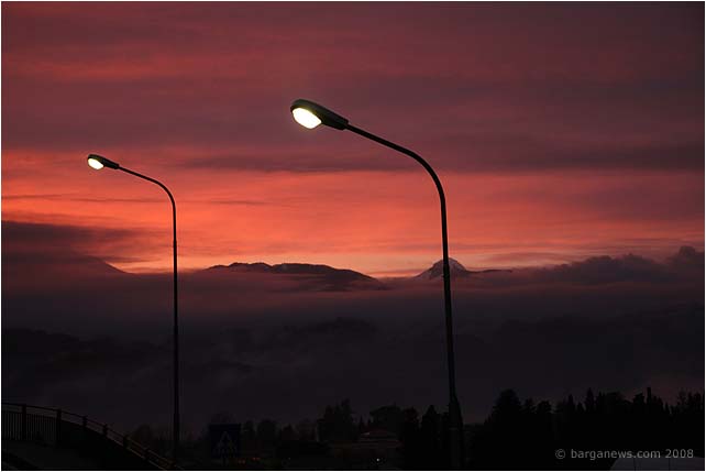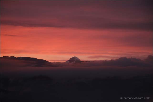 Not something that we would normally publish but some images that the barganews award winning photographer O’ Connor brought into the office this evening probably deserve to get a wider audience than just his Daily Images column (although that does get an awful lot of traffic) Low rain laden clouds parted for just a few minutes allowing an almost horizontal reddish light to diffuse across the whole valley. The snow covered mountains bounced the light back up on the clouds to give a subtle glow to the whole affair. O’ Connor swears that there was no photoshop trickery or filters in his images just straight images that went through his lens untouched.