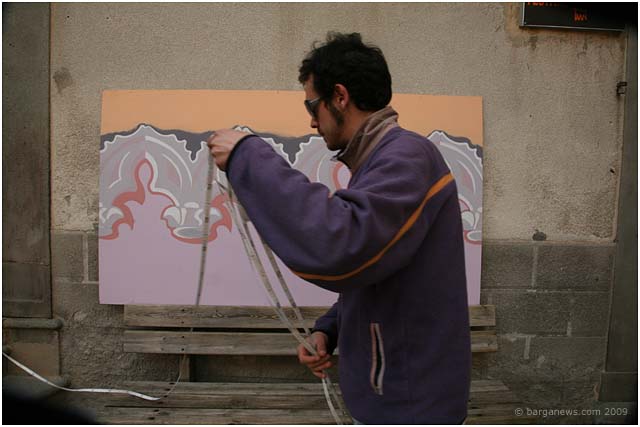 This afternoon Luciano Zanella, painter and specialist decorator and well known in Barga Vecchia for his work on some of the other large palazzo’s* and Geometra Nesi were trying out a colour test on the outside of the building. According to the pair, if the project is passed and goes into the next stage where the plaster work on the front of the building to replaced, they could be repainting the façade some time this summer.