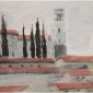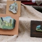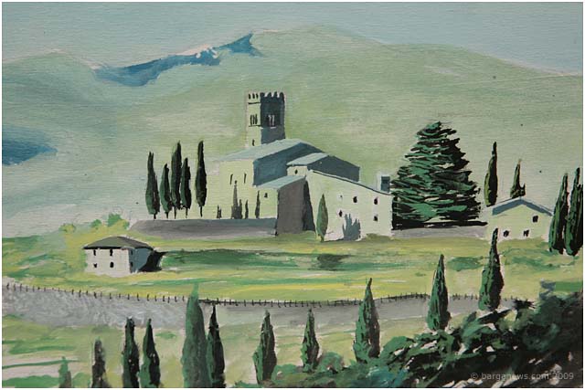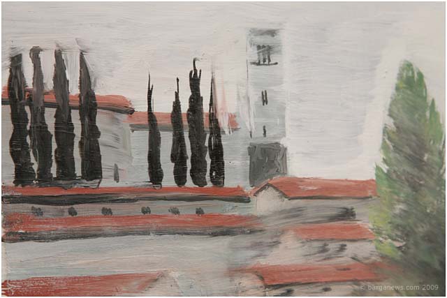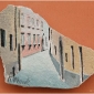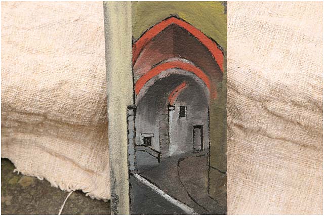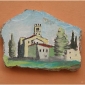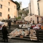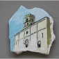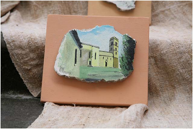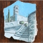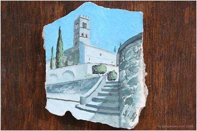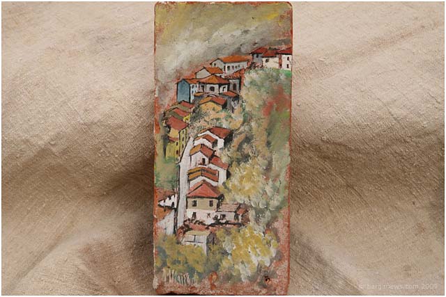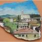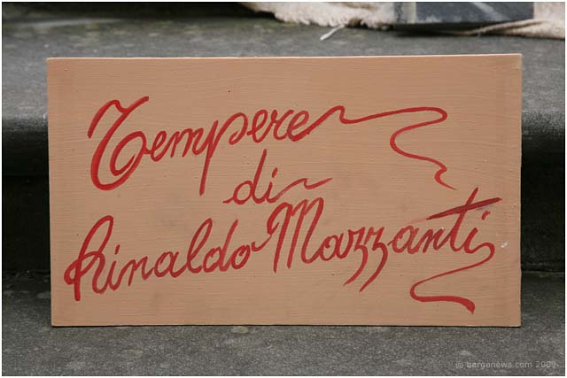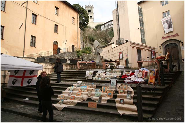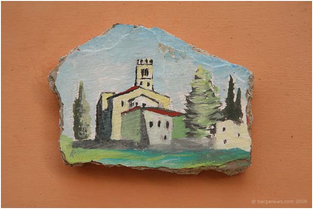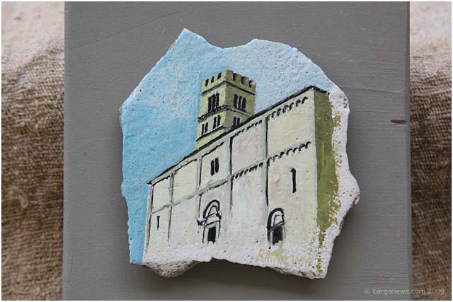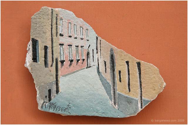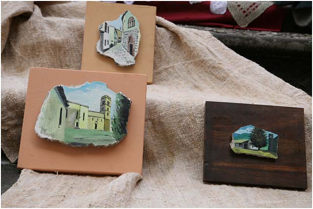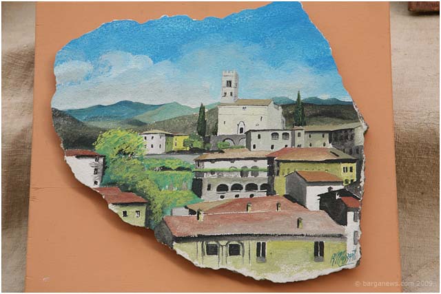 As part of the traditional monthly market in Barga Vecchia, an exhibition on the steps leading up the Teatro dei Differenti caused many people to stop and browse. A new artist to the Barga cultural scene, Rinaldo Mazzanti from nearby Gallicano was exhibiting his work for the first time in Barga. Small fragments of plasterwork salvaged from some of the many renovations taking place in this area and used as a base for views of Barga Vecchia and surrounding territory. The shape of the found plasterwork defining the image that Rinaldo painted. Long vertical fragments becoming views of the Fornacetta, horizontal ones becoming the Duomo. Rinaldo is well known in his native Gallicano for his fine draughtsmanship and drawings, now he has opened up new vistas as he explores colour and various brush techniques.