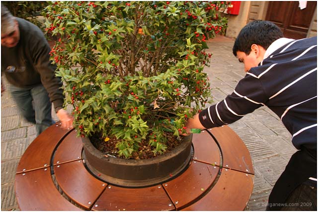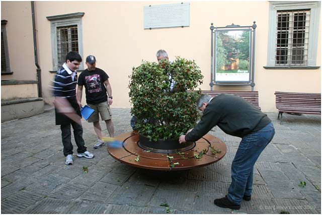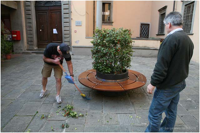 A couple of years ago the Comune bought and installed some new street furniture – benches, signs, rubbish bins and two large cast iron circular seats which were positioned in the two principal piazzas of Barga Vecchia – Piazza Angelio and Piazza Salvo Salvi. Visitors to Barga could rest their aching legs and admire the plants that were planted in the middle of the large cast iron circular bases.