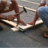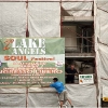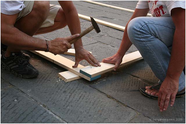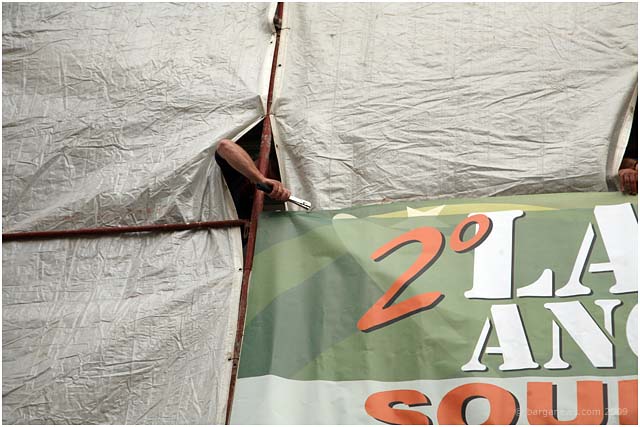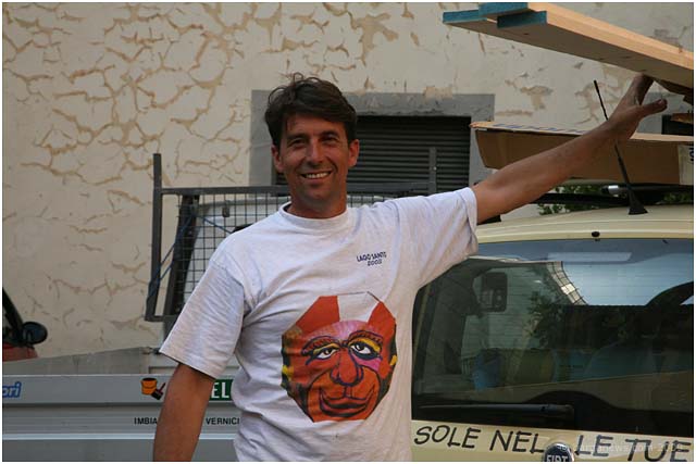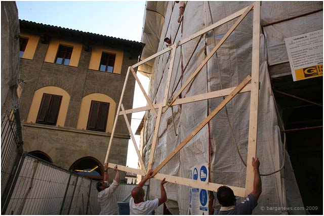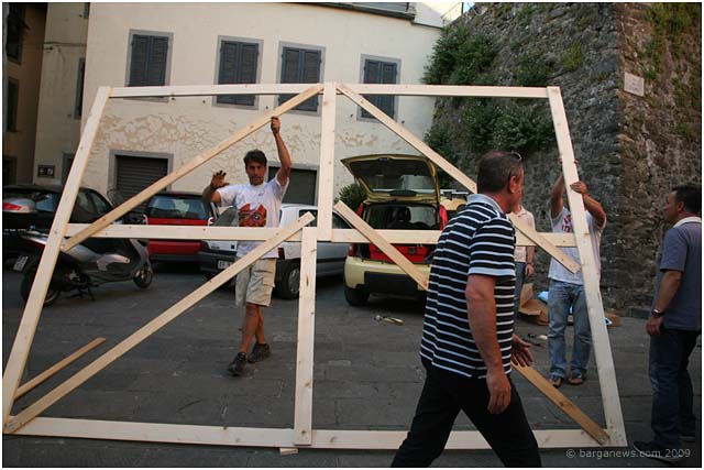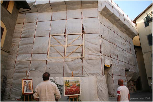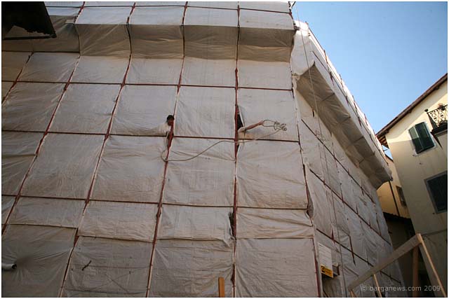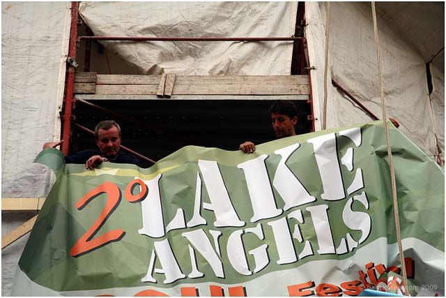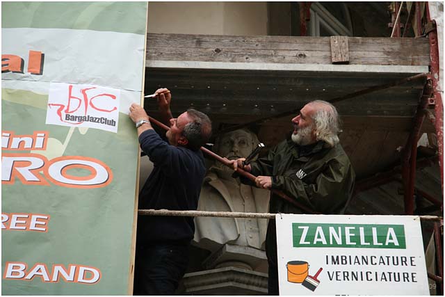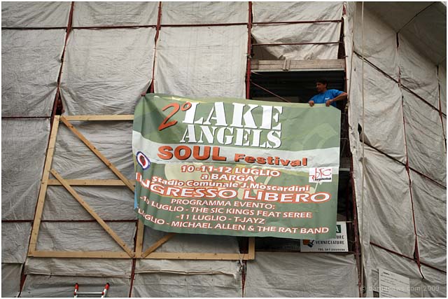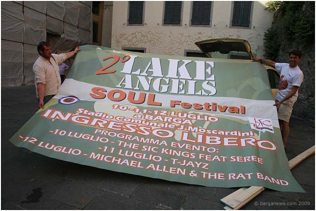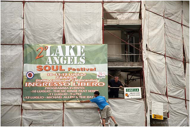 The Lake Angels have just announced the dates for this year’s Soul Festival. Last year they did this at Gallicano during a dinner for two hundred and fifty people sitting down to eat for the annual Solidarity Evening organised by the Kwizera organisation (article here) This time it was a more “Barga” affair as they chose to publicize the event via a 4 by 2 metre advertising hoarding erected up on the side of the Palazzo Angelio in Barga Vecchia. The Palazzo which has been undergoing long awaited renovations has been covered up by white plastic sheeting since April and has been the center of some heated debate as to just what colour it will be once the scaffolding comes down (article here) What better place for the Lake Angels to put their publicity .. it cannot help but be noticed.
