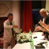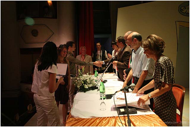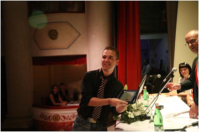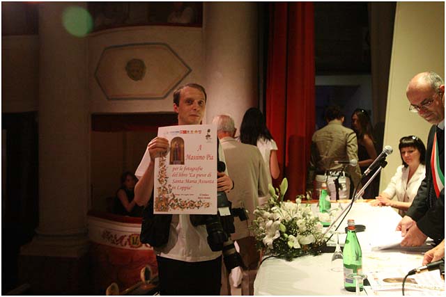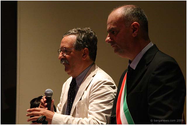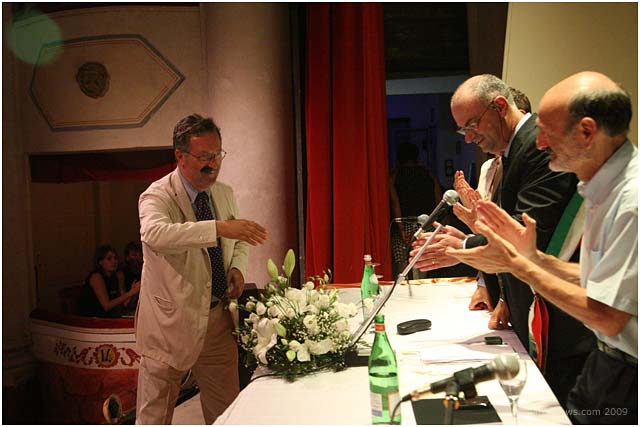 A packed Teatro dei Differenti this afternoon for the annual Saint Christopher Gold Medal awards. Now in its tenth year and this season something very different to the normal format. A series of prizes and recognitions for people in various sectors of life here in Barga were presented but only one Premio San Cristoforo d’Oro (Golden St Christopher medal) – and that was awarded to the man who promoted the idea of giving annual gold medals in the first place – Prof. Umberto Sereni.