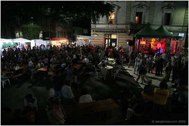 San Rocco in Barga is the time of year when you take your knives and scissors down to Umberto the Arrotino – the knife sharpener. It is also the right time in the season to buy onions and garlic for the winter. Once again just like yesterday, the air is filled with the sound of bells – this time coming from the San Rocco church in Barga Giardino (3D moving image here) calling in the faithful. Outside of the church the day seems more to do with shopping. The market stretches right through the Giardino area making progress slow for traffic and walkers, shoppers alike and then once the evening comes the road is totally blocked off, tables are set out and a huge mat laid down all ready for the dancers. It’s liscio time – this year with a new group – the Danilele Amoroso Orchestra from Empoli.
