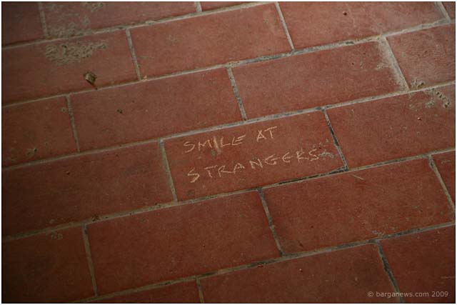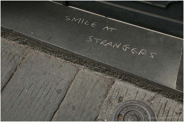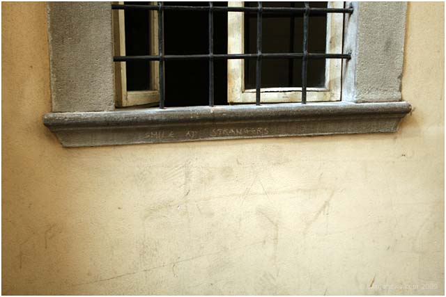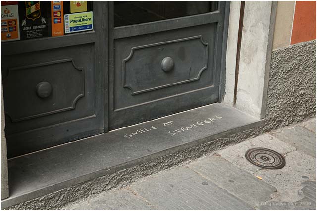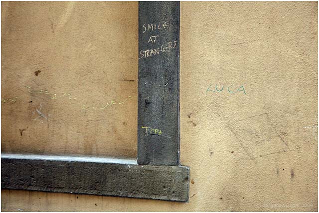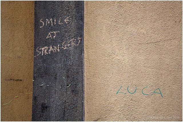A few years ago in Barga during the summer months appeared overnight a series of messages scrawled on the walls of Barga Vecchia announcing to all who would read than they should “smile at strangers”. These enigmatic messages were written in chalk and so disappeared as soon as the first wet weather of the autumn swept through Barga.