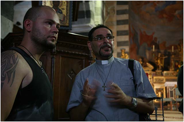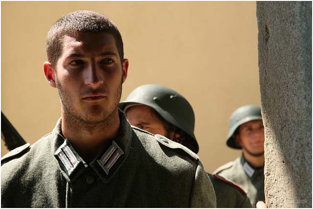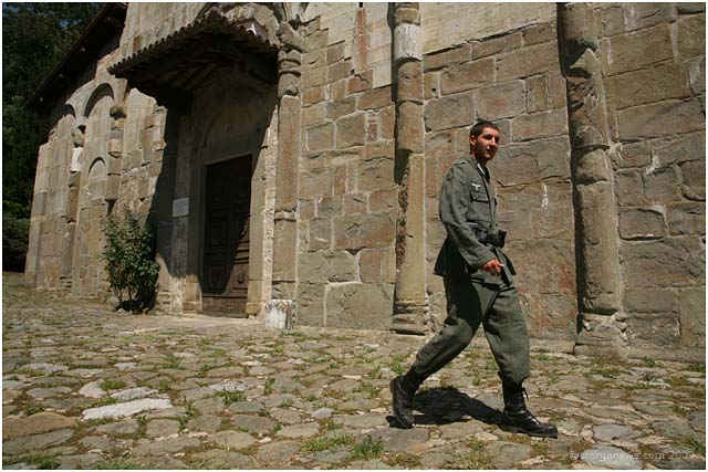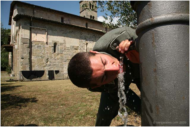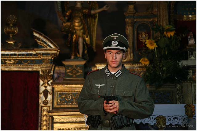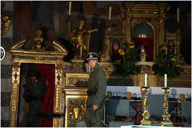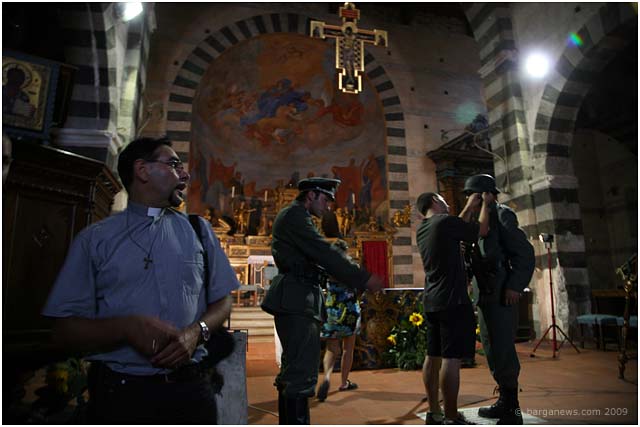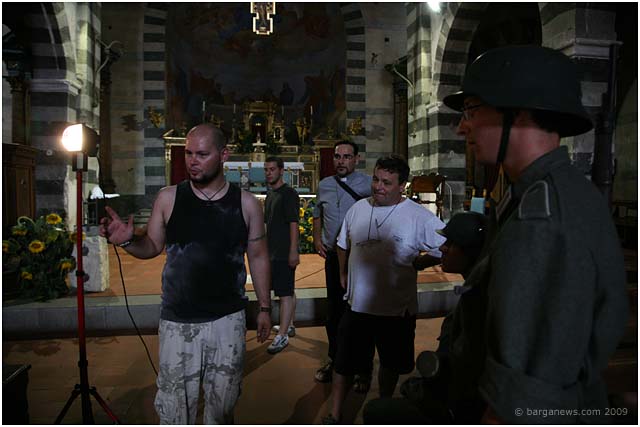 We first started reporting on the making of this film this back in February of this year. In that article we talked about a new name to add to the list of artists working in this area – the film maker, David Melani. He has been starting to make a reputation not just with his directing or his editing skills but also with his drive, purpose and all-round organisational abilities as he has been gradually putting together over the last couple of years a complete team dedicated to film making using local actors and technicians. His short film “Natalino” is based around a comic strip drawn by Nazareno Giusti involving the tragic story of a small boy injured during the war in 1944. In March they were filming in Barga before moving on to film in Ghivizzano Alto, Borgo a Mozzano and Ghivizzano. This week they were back once more filming in Barga using the church at Loppia as the backdrop to one of the final scenes in the film.