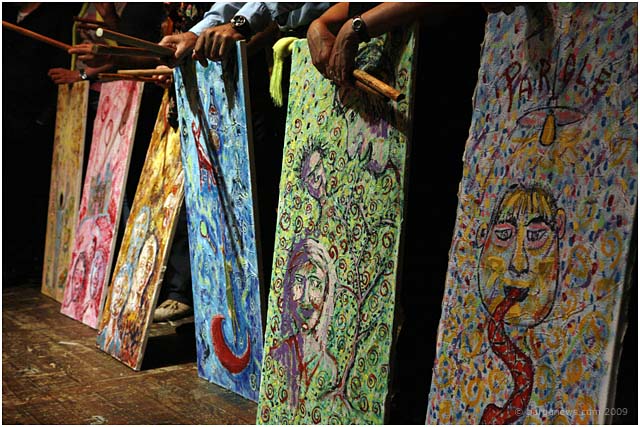 Sergio Fini’s visual work also appeared in the production in the form of 6 large paintings each one depicting different forms of madness. This evening they only explored three of the possibilities so effectively we only got a chance to see 50% of the Ship of Fools. We look forward to seeing the other half some time in the near future.