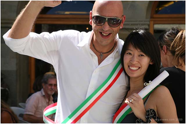 Sally arrived in Barga in June as part of the Cardiff International Academy of Voice – master classes for budding professional singers with the world famous tenor Dennis O’Neill. Her soprano singing did not just capture the attention of audiences in the theatre but also captured the heart of Riccardo Negri of L’osteria Angelio. Their whirlwind romance just took a more permanent step forward with the announcement last night of their engagement. A large ring on her left hand bears witness to this fact. Wedding bells are expected in January 2010