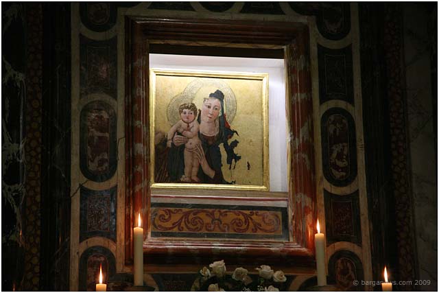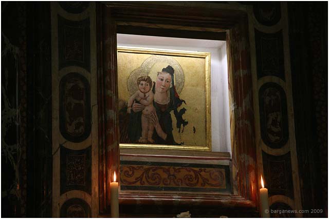 A painting that has been away from Barga for a considerable time while it was being restored finally came back to it’s rightful place – on the wall of the chapel in the San Francesco church. The small painting on wood of a Madonna and child was probably painted by Pietro da Talada – a minor 15th-century painter was also known as The Maestro di Borsigliana and who was an exponent of the International Gothic style during the early 1400’s.