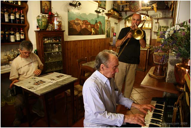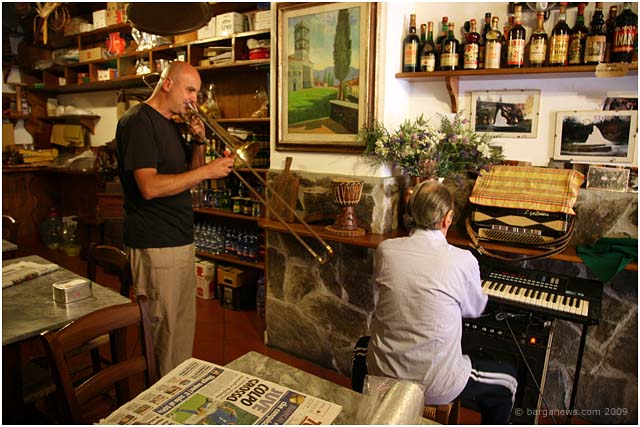 Nicolao Valiensi and Aristodemo Casciani duet on keyboards and trombone at Aristo’s bar in Barga Vecchia.