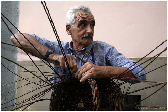 One of the regular participants of the market held every second Sunday of the month in Barga Vecchia is the wicker basket maker, Rino Mariano. He comes in each month from his home over the mountain in Gassano (Massa Carrara) bringing with him his bundles of willow, a chair, a plastic bucket of water (in which to soak the willow to keep it supple) a pair of secateurs to trim the finished baskets and nothing else except his pair of hands and his many years of experience making his deceptively simple looking wicker baskets.