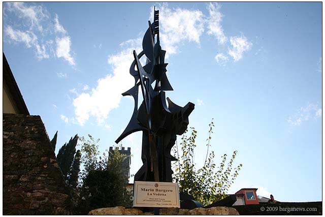 The artist Mario Bargero unveiled his latest large sculpture this morning as part of the ongoing celebrations for the 4th November. Entitled “la vedette” – “the look out” or in military terms – the forward observer, it is now situated at the Museum of Memory in Barga Vecchia. The new museum was built on the site of a palazzo hit by artillery during the last world war and left as a rubble for 60 years. The complex now comprises museum, gardens, viewing terraces and “la vedette” watching over it all.