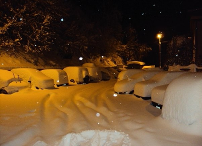 I’ve got the Virgin Mary in the back of the car though. And to be fair you can see why she got the job, as she looks exactly like your internal picture of the real one back in about 10 BC, albeit maybe a bit cleaner. And right now, you can tell from her face she’d rather be on the back of a donkey than in my car. The school is down in the valley far below, and when I got there it was only pretending to snow. As we begin the climb back up the steep, winding road to Vallico Sotto, it really starts to snow. Proper snow that sticks to the road. And Froggie, with his old worn-out wrong-sort-of-tyres and total lack of preparation for winter, starts to slip and slide. After ten minutes of incredibly slow driving in second gear we get back to the Vallico car park and I reckon we have something like five minutes to spare before the road becomes impassable. Lucky.
