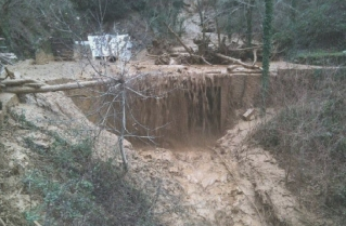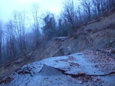 Now a question – where did all that mud come from? I know the Foce di Pompanella road (the green one on my picture) is a few thousand feet straight up from the Valsozza bridge. Perhaps I’ll get a better view from there. The next day I climb about a mile up the road, as far as a tree-trunk barrier that someone has rapidly fashioned to block the way. Past the barrier, round a corner, and you get the shock of your life. The Foce di Pompanella road isn’t there anymore.