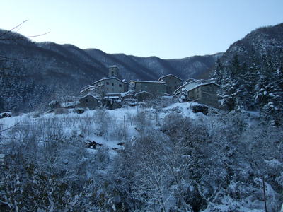 Back in the world of grown-ups, there are problems. Just around the time of the first snowfall Sammy and I realized there wasn’t any food in the house, and we were just about to plan an expedition to the big Leclerc supermarket in Gallicano when the snow came. So now we’re likely to be stuck here for days with nothing to eat. Now, why don’t we just go to the local shop, you might ask? Well, first of all of course, Sammy’s got to have her bloody soya milk and other rare delicacies that they don’t stock in village shops – Christ, there’d be tantrums if she was stranded on a desert island – but the most important point is that we don’t have a village shop any more. We used to, mind, but sadly it closed a few years back when local baker Mario – husband of the lovely Adelina from behind the counter – built a giant new emporium for her down in the main valley miles away. If you visit Da Mario in Piano di Coreglia, tell them to come back. We miss them. There was a village restaurant too, but that closed a few years before the shop did. There is still a bar, but it’s a sort of members-only workin’ mens’ club (apparently so they don’t have to pay tax on the beer) and it’s not the sort of place you go to have fun in winter. So basically we’ve got no services left at all. When the villagers were offered a mains gas supply a year or so before we arrived they voted against it, on the grounds that Mario would always bring round the enormou