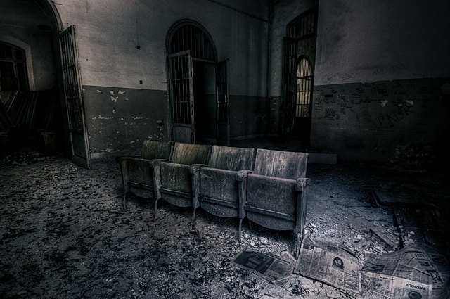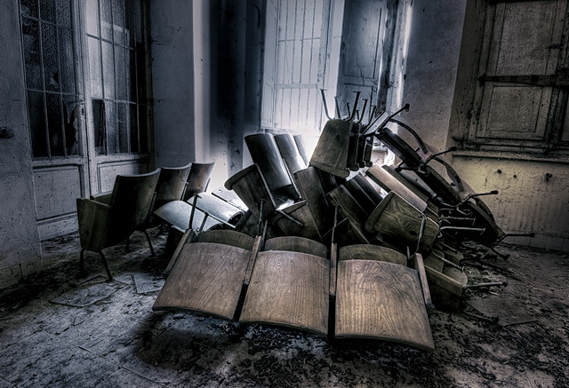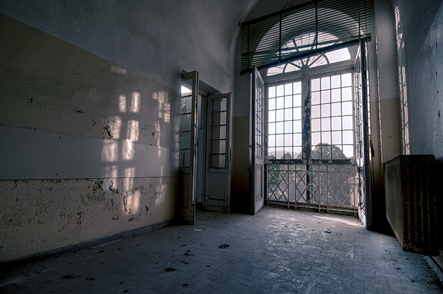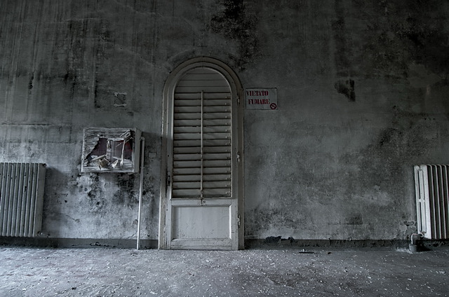 Manicomio is a series of images taken inside a number of abandoned mental asylums. These eerie desolate and derelict buildings are most often spread across a fair acreage of quiet rural countryside. Built sufficiently out of the way to ease the social conscience, traces of former inhabitants remain both inside and externally in the grounds. Some poor souls remained in locked rooms or wards –‘for their own safety’ while others may have been afforded the luxury of walking out of doors in a secure, permitted area. Many of these people were abandoned and forgotten. These ‘skeletons in the cupboard’ often lived a whole lifetime and died in an asylum which was the only home they had ever really known.