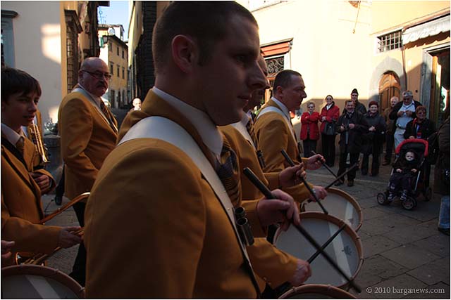 orchestra entering Barga vecchiaAs part of the continuing process of twinning between the two cities of Barga and Hayange in France, the two Mayors of Hayange and Barga welcomed the Harmonie Municipale de Hayange this morning as they marched through Barga Vecchia in prepararion for a concert in the Teatro dei Differenti later on today