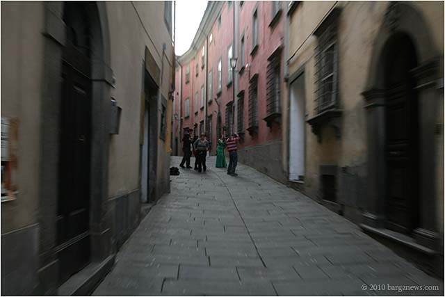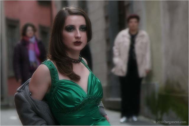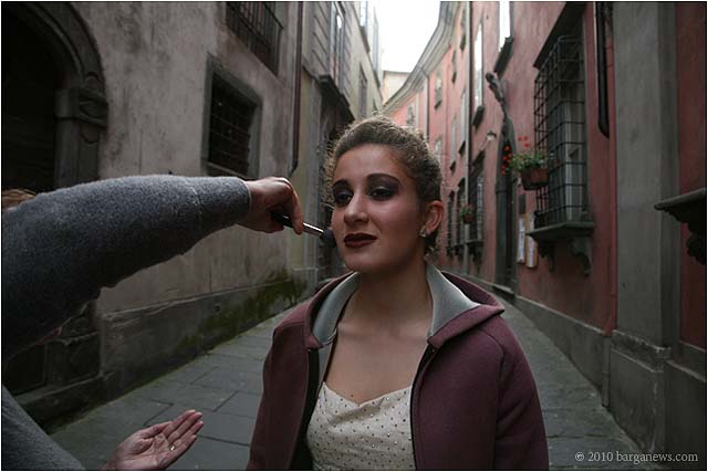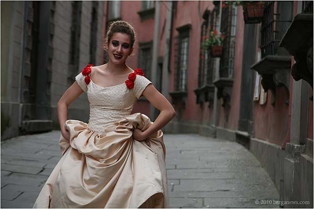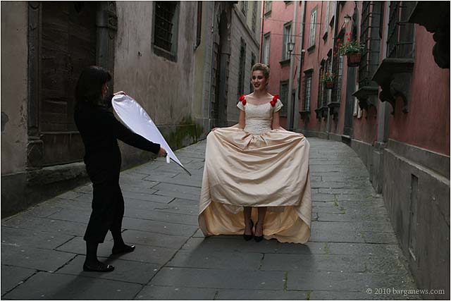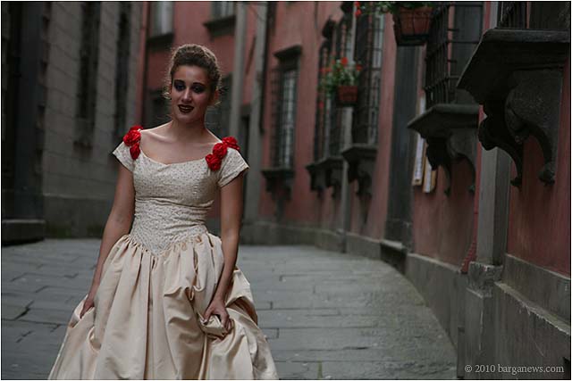 No…….. the two girls spotted in Barga Veccia on Friday evening were not professional models! They were local schoolgirls Sonia Orsucci and Mariella Ciniglio! These two beautiful young ladies were kind enough to model for professional photographer Hamish Scott-Brown who is at present collating a body of work based on eco fashion and the Scottish- Italian connection. Hamish’s wife Fiona is responsible for sourcing the gowns from sustainable outlets, styling and make-up.