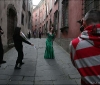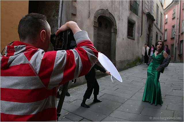 This week he was back in the area photographing two models using Barga Vecchia as his backdrop. We caught up with him just outside the Casa Cordati using the large pink facade of the centuries old palazzo as a perfect complimentary colour to the green dress of one of his models.