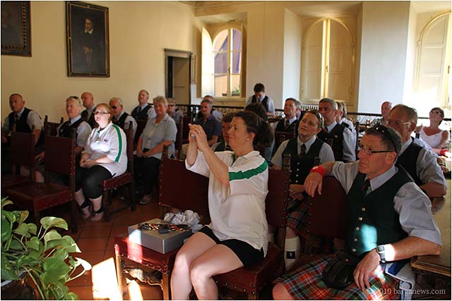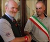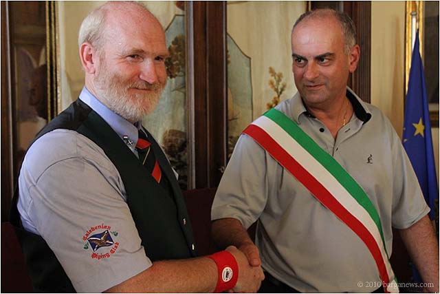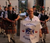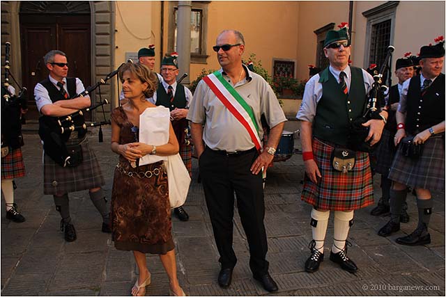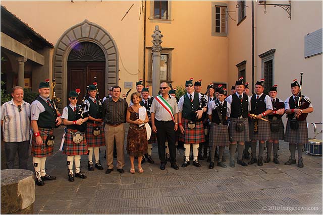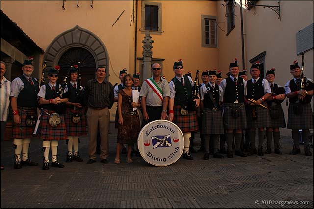 The Caledonian Pipe Band from Saltcoats, North Ayrshire, Scotland were back in Barga today for a reception in their honour at the Palazzo Pancrazi. The mayor of Barga, Marco Bonini presented then with a commemoration plaque and flags for their visit to the city. They in their turn presented at the city with gifts from Saltcoats.