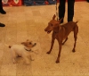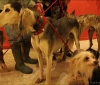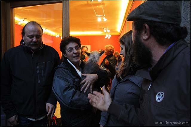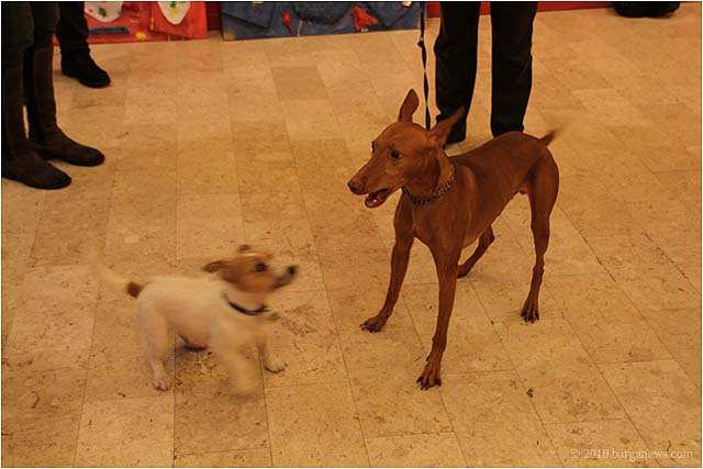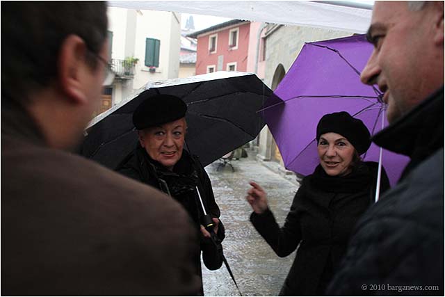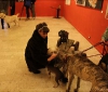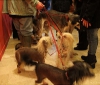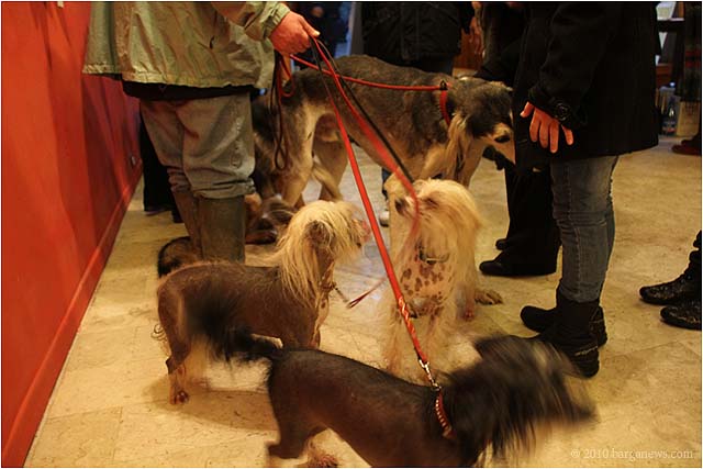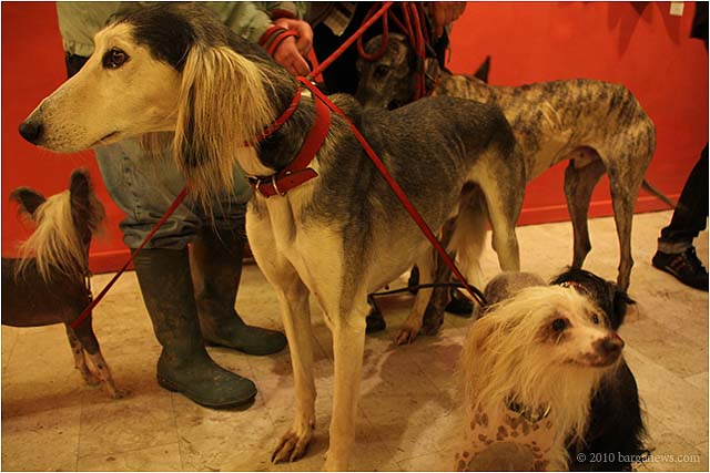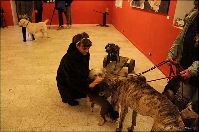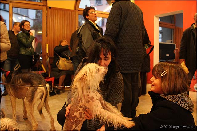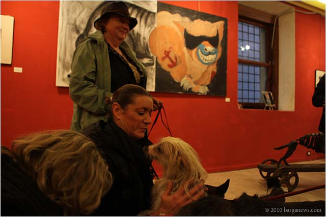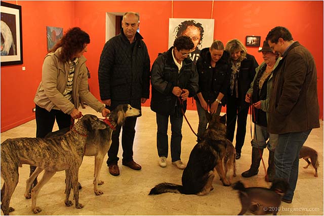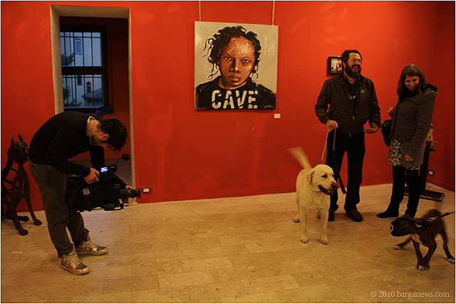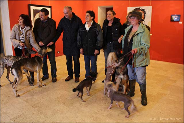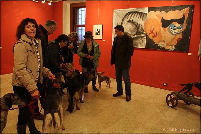 The Cave Canen exhibition closed this afternoon in Barga Vecchia exactly as it started a week ago – with the sound of rain falling outside in the piazza, dripping umbrellas and wet footprints across all the floors in the three galleries holding the exhibition. The only difference today was that the wet prints were not just human but also those of the many dogs which turned up for the closing ceremony. Karin Schirmer from the Intissar’s kennels who had brought along some of her special breeds of dog to show to the public – her award winning Sloughi and Chinese Crested dogs plus many other canines brought in specially for the event by members of the the animal rights Association “L’ Arca della Valle”.