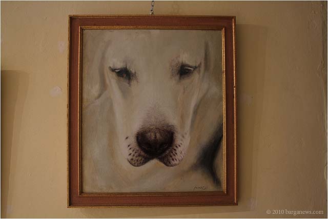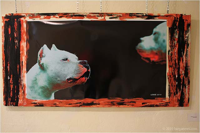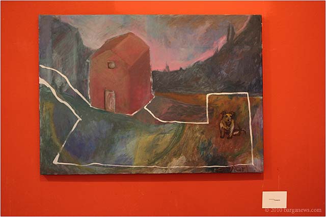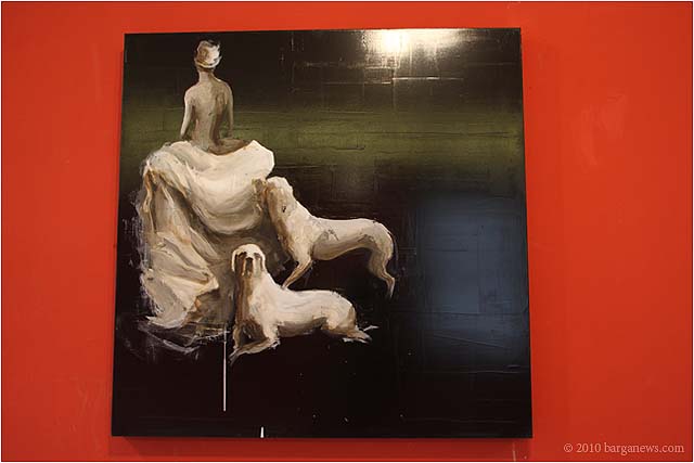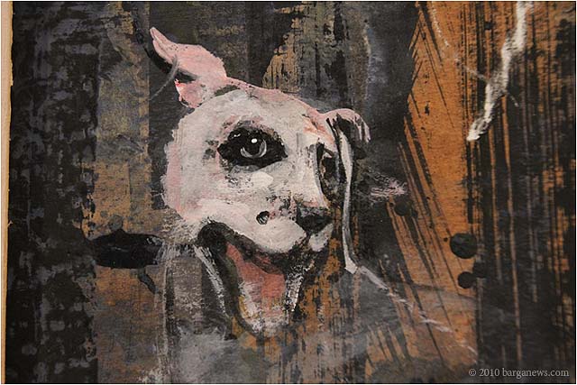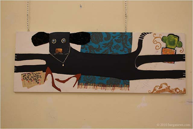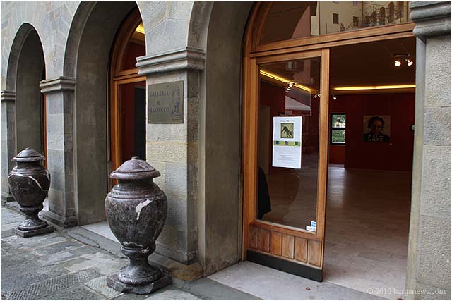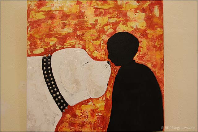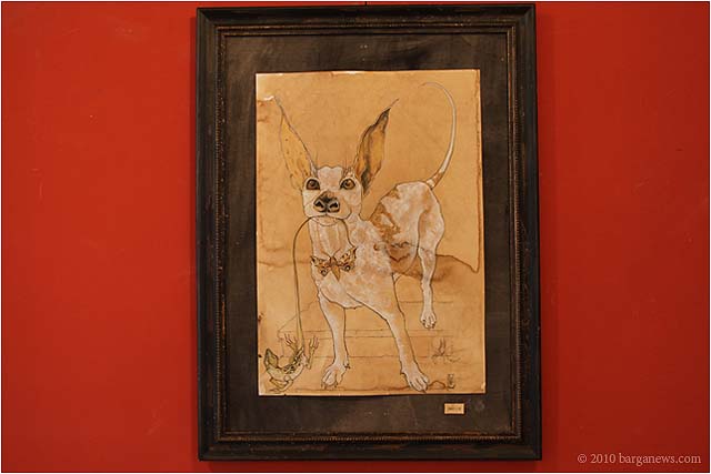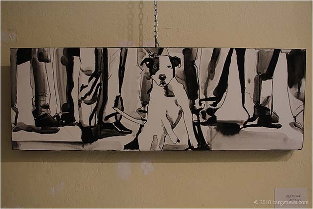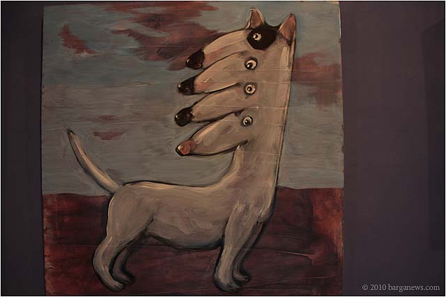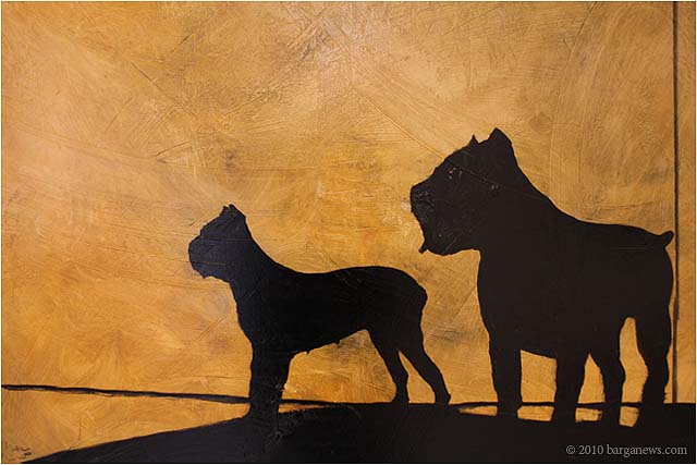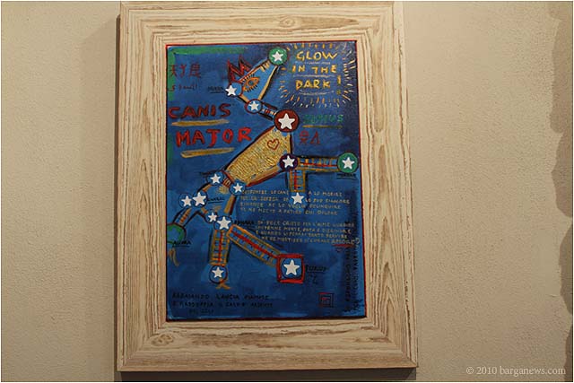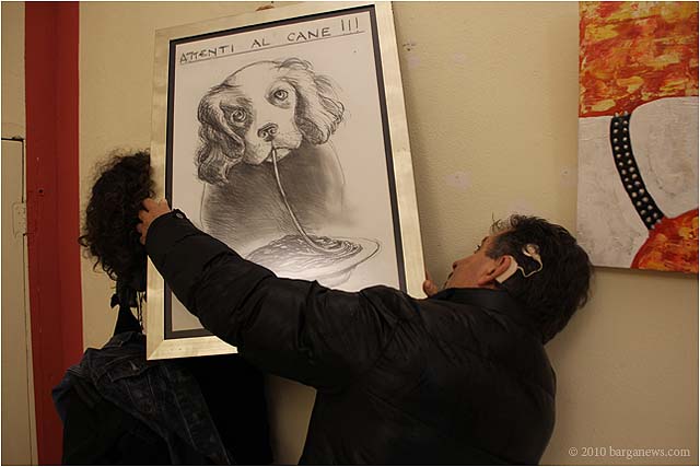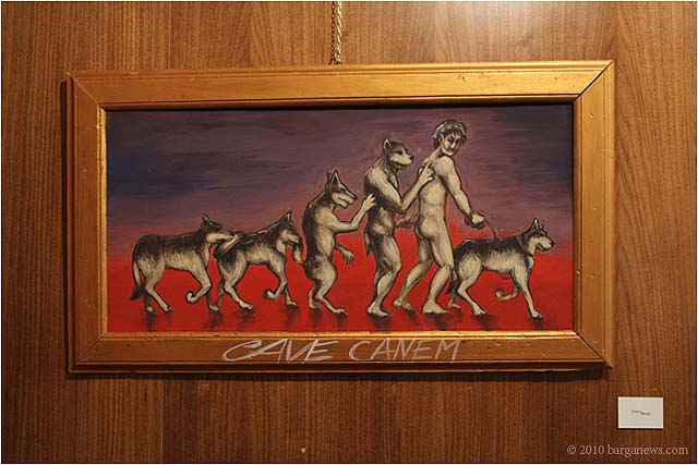 When 73 artists join forces to present nearly 100 paintings, sculptures, videos and poems on a single theme, the result can’t really be called something as limited as a mostra (“exhibition”). It’s more in the nature of an encyclopaedic survey. In the case of Cave Canem, the event that opened in three Barga venues November 1, the encyclopedia’s sweep covers virtually everything known, suspected or fantasized about dogs – mostly, but not exclusively, in their relations to human beings.