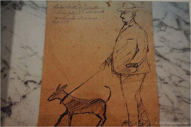 There are modest dogs and celebrated dogs, among them the poet Giovanni Pascoli’s constant companion“Guli,” pictured in two early 20th-century photos and a simple line-drawing by Pascoli. There is a dog who distinctly resembles Tony Blair. There is Paola Marchi’s wryly contemplative astral dog in the constellation known as “Canis Major”. There are, inevitably, odes to dog paw prints in wet cement and dog doodoo in the footpath. There are poodles and Afghans, beagles and Jack Russells, in poses that range from the masochistic and the maudlin to the cuddly and the kitsch.
