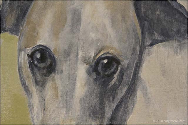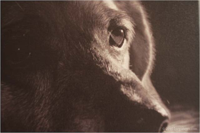 If any single element links these enormously varied works, it is the observation that dogs are among Nature’s great observers – keeping their eyes trained on their two-legged erstwhile masters, trying to second guess a far more erratic species of Mammalia than their own. Take a close look at faces of the dogs on these walls, notably in Luca Galeotti’s close-up photo of a terrier’s eye and Leslie Millar’s painting of her mother’s Labrador. They’re watching you closely, following your movements and reactions, as well they should given the millennial record of human vagaries.