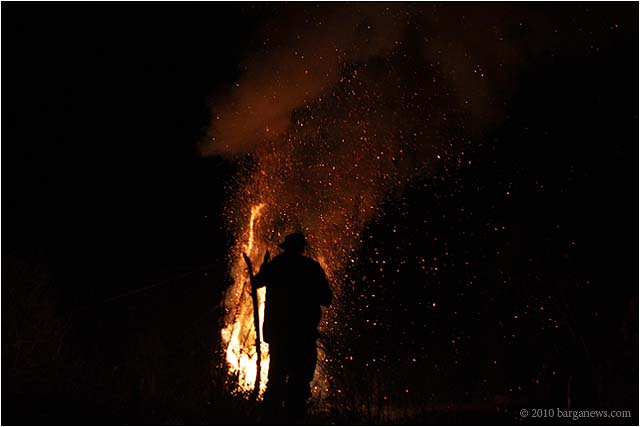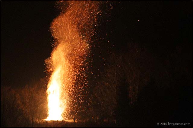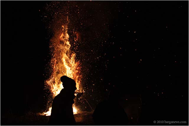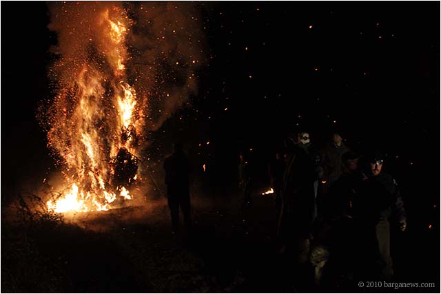 The first thing noticeable upon arriving at this tower was the absence of elder men from the village. Here was a much younger group who had built their tower. Due to the rain fall over the past few weeks everything was soaked and so they were dousing the tower with large amounts of paraffin to make sure that when it was lit it would burn well. It would seem that there was also a quantity of petrol mixed in with the paraffin because as they moved round the tower with their flaming torches ready to light it on the stroke of 6pm as the church bell tower rang out something unfortunate happened.