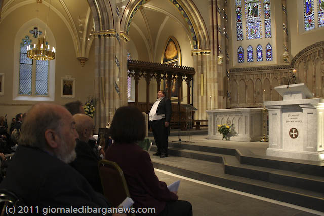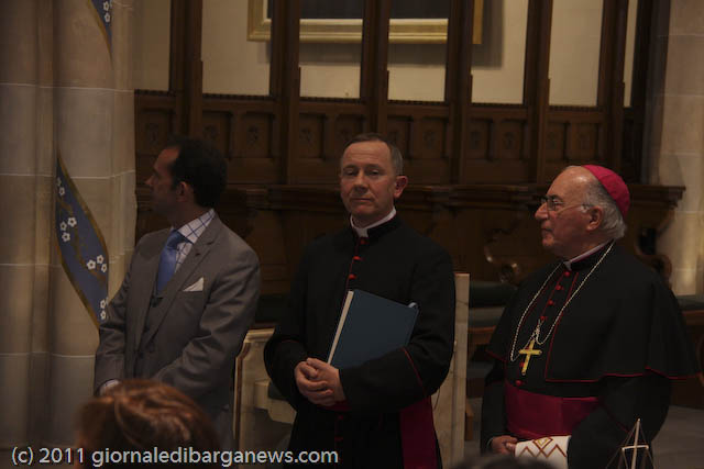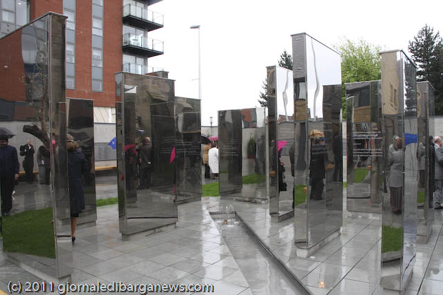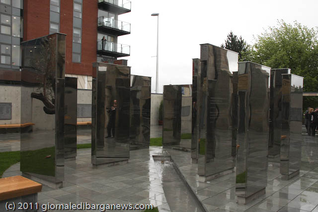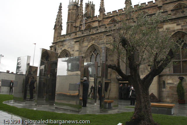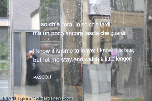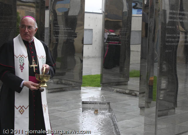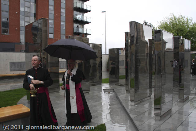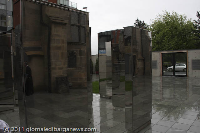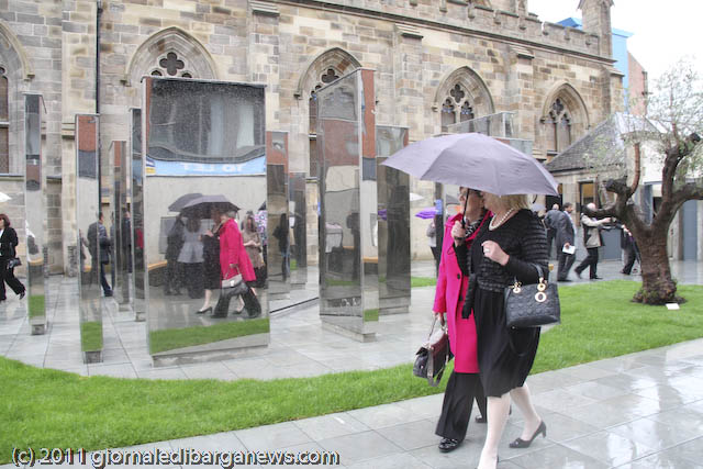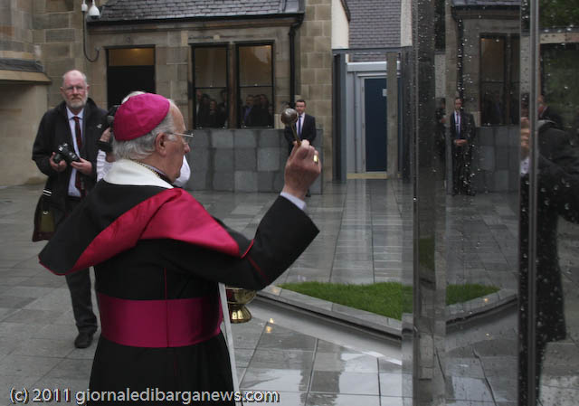 Prima che l’arcivescovo Conti benedicesse ed inaugurasse ufficialmente l’Italian Cloister Garden, ha commosso i presenti l’Ave Maria cantata da Luigi Corvi, ma l’emozione vera dei tantissimi presenti (la cattedrale era completamente gremita), soprattutto degli italo-scozzesi, è venuta con la visita al chiostro ed al suo monumento: un labirinto di grandi plinti ricoperti a specchio in cui riflettendosi si può volare sui propri pensieri, ispirati dai brani di poeti italiani e delle sacre scritture che vi sono incisi.