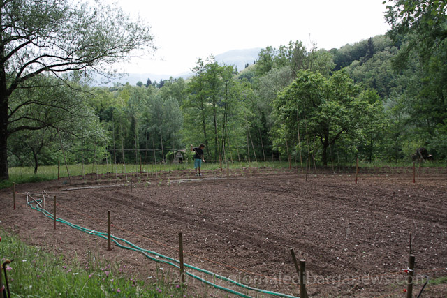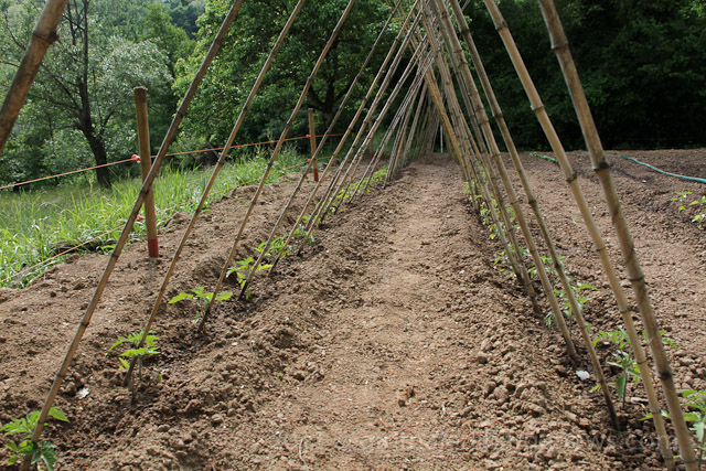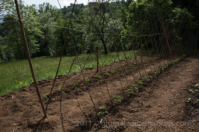 Time for planting and seeding in the vegetable garden. So far 100 tomato plants have been put into the ground comprising four different types – three mainly for bottling later on in the season for pomarola, and the fourth for salad during the summer. Two types of dwarf runner beans have been sown in the bottom field along with a couple of lines of peas, which we will try for the first time this year.