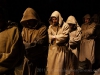 Si è quindi pensato di usare soltanto pochi simboli scenografici: una pedana di quattro metri posta sullo sfondo per creare due piani, una scala per permettere di salire sulla pedana stessa e tre archi per simboleggiare una cattedrale.