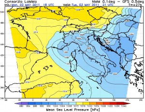 Dal tardo pomeriggio odierno un minimo relativo di pressione (1006 hpa) si formerà tra il Golfo del Leone e la Liguria (vedi foto), richiamando temporaneamente aria piu fredda (-20 a 3000 metri) da nord che andrà a rinvigorire l’instabilità latente che ci sta interessando da un paio di giorni.