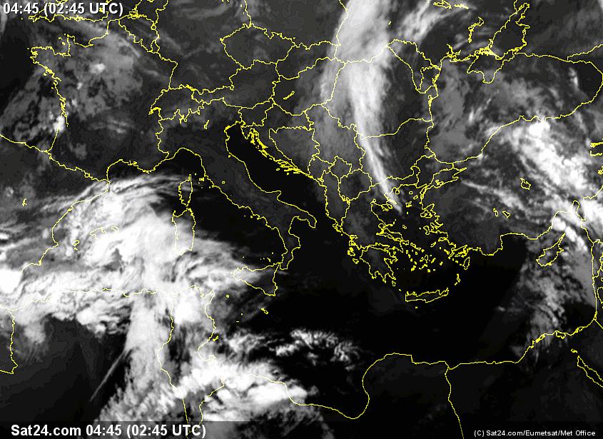 Dando un’occhiata al satellite (vedi foto) possiamo notare il Mediterraneo ricoperto di nubi che interessano già la Sardegna, la Sicilia e stanno iniziando ad abbordare la Corsica. Il sistema nuvoloso, nel suo movimento verso est, nord-est, provocherà un aumento delle nubi a partire dalla tarda mattinata ma con fenomeni scarsi o addirittura assenti.