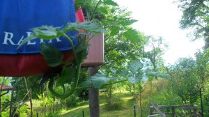 An unexpected turn of events, the upside-down tomatoes have done a U turn and are now going up in the world. They have seen the light and are heading for it.